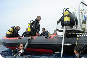 Cuando queremos realizar una inmersión fuera de la Mar Menuda, disponemos de un servicio adicional de barca con motor fueraborda que nos lleva rápidamente al punto deseado.